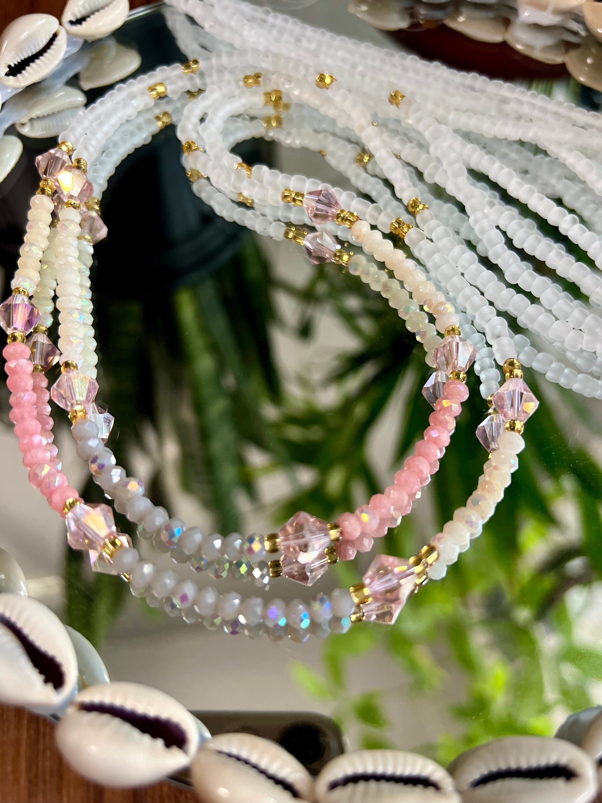 Gorgeous color scheme of matte clear, pinks, grays, and beige. The diamond shaped facet beads give that bougie touch to boost your femininity.