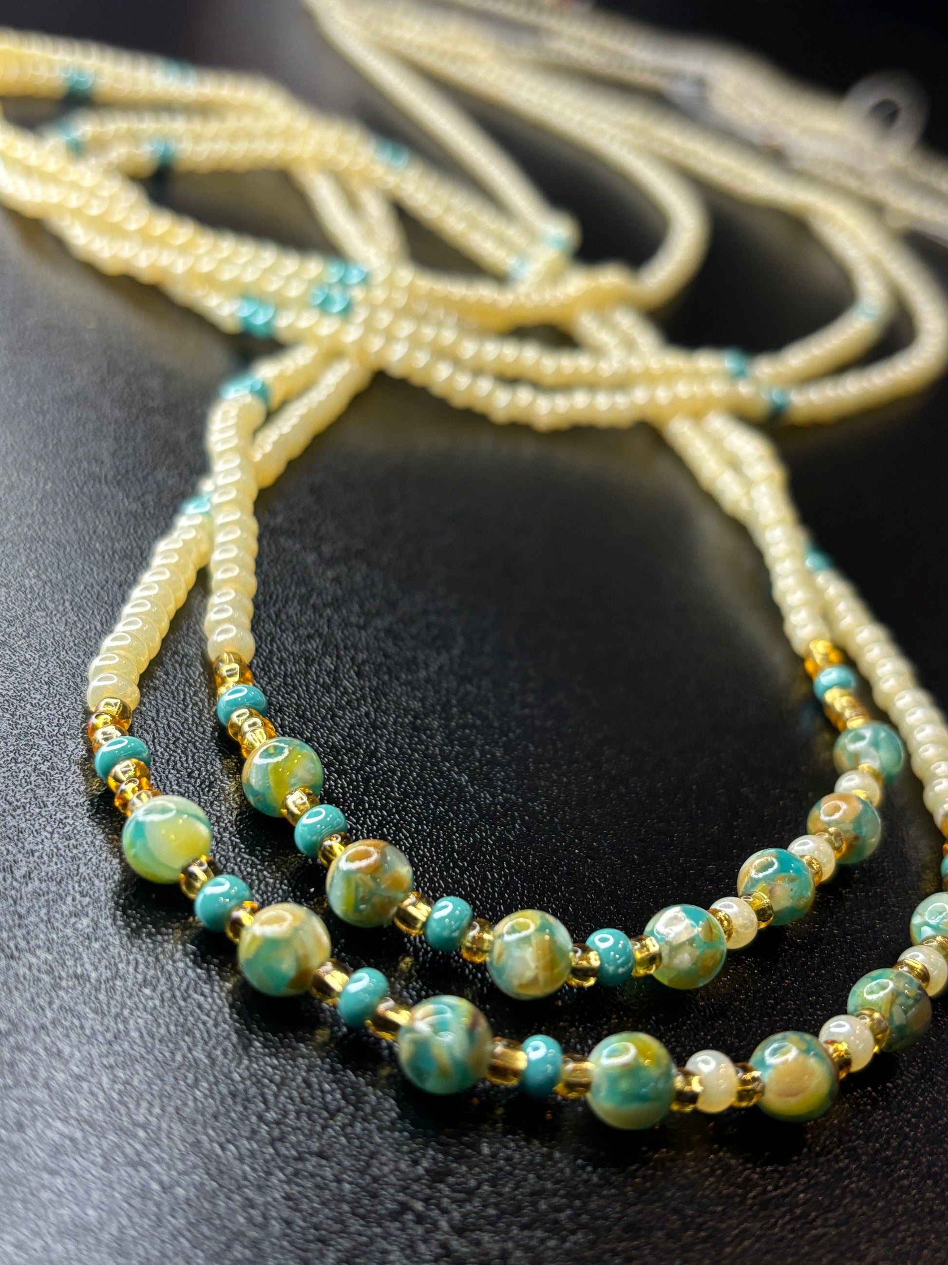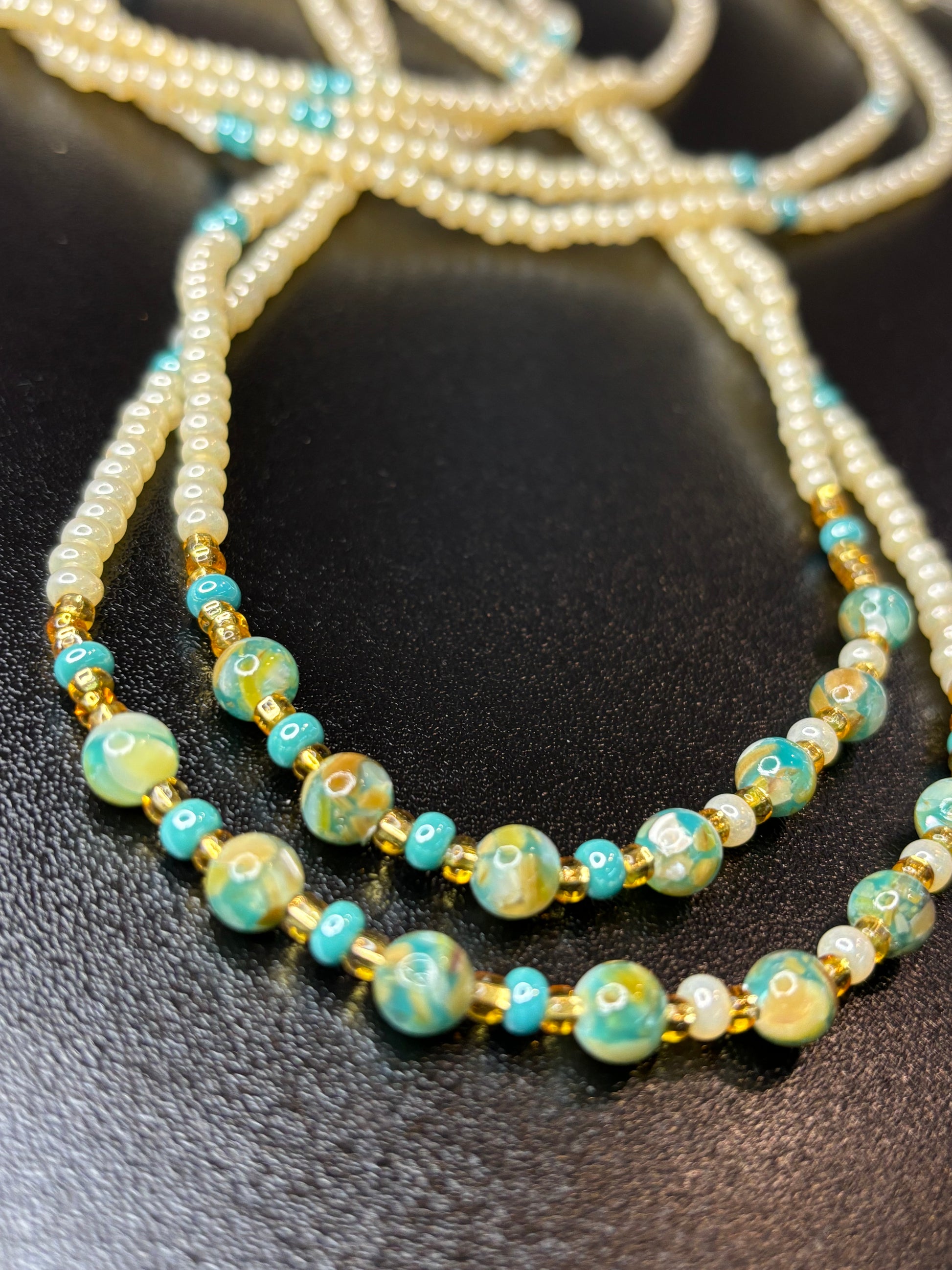 Waistbeads created cream and luster turquoise beads, adorned with dyed agate.