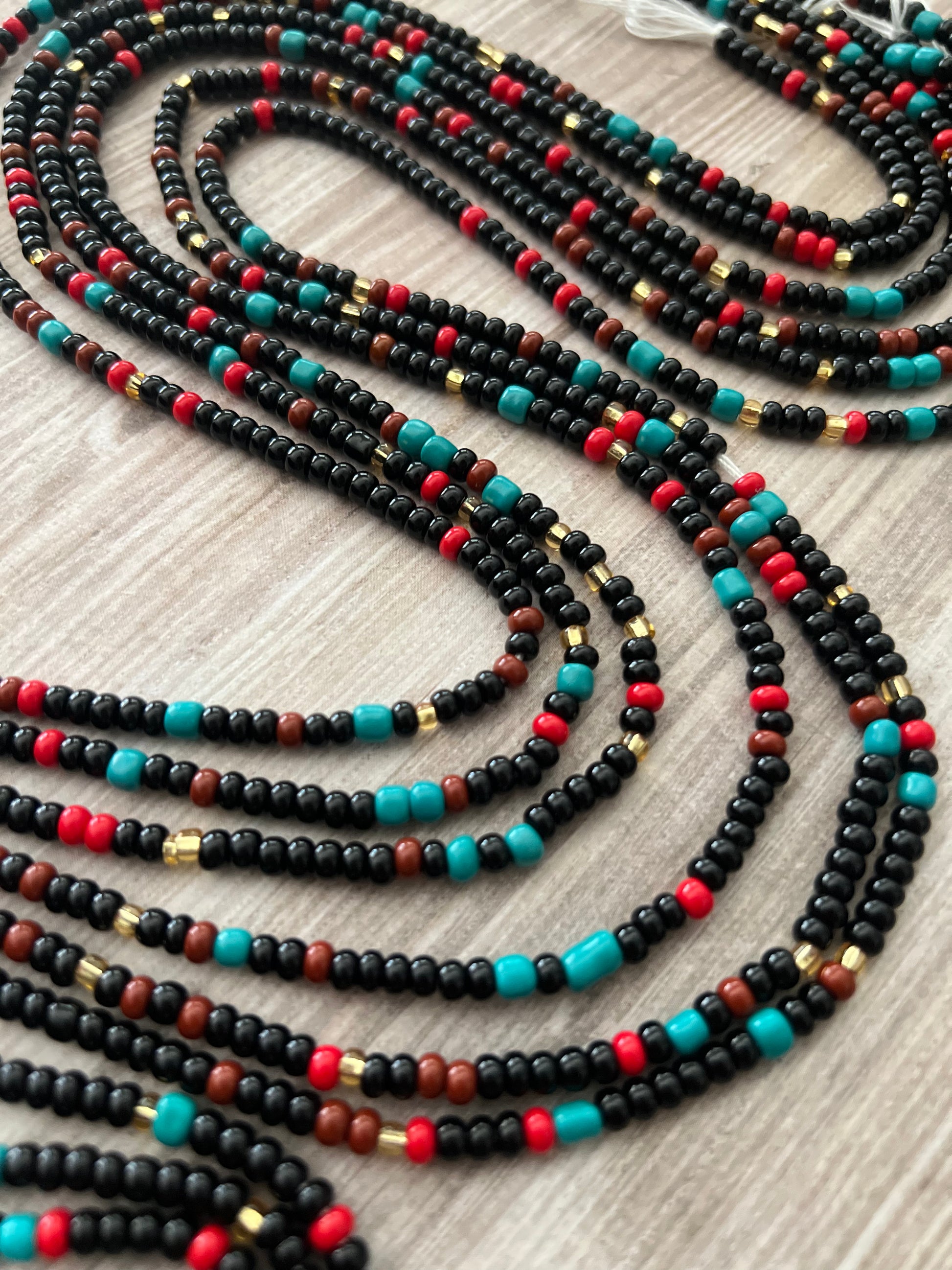 A single threaded waistbead created with a bowl mix of black, red, teal, gold, and brown.