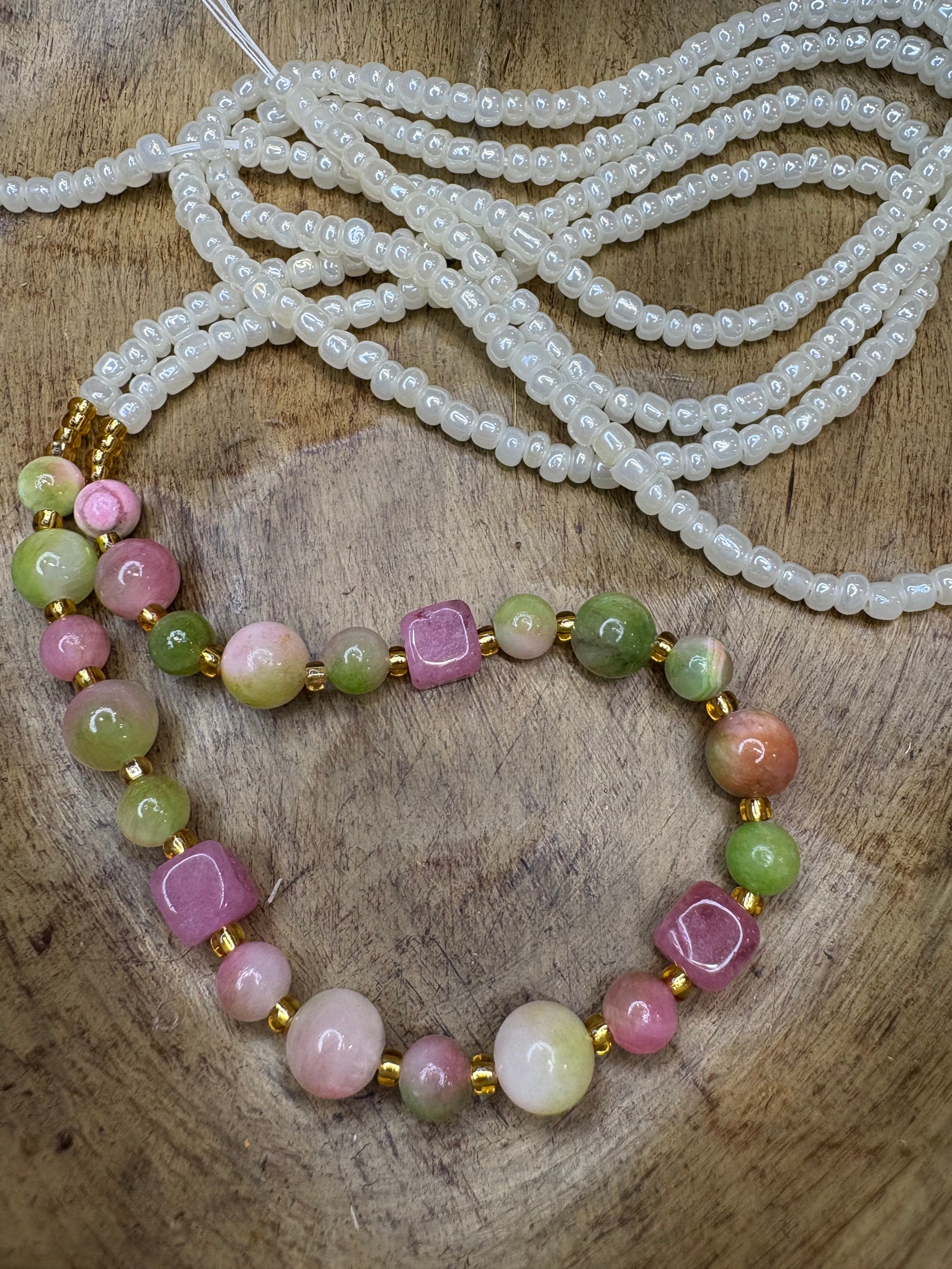 Pretty and fresh feeling waistbeads with floral agate and strawberry quartz.